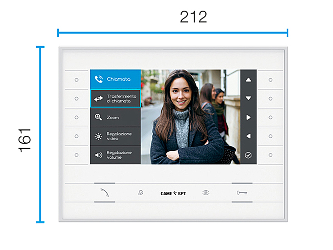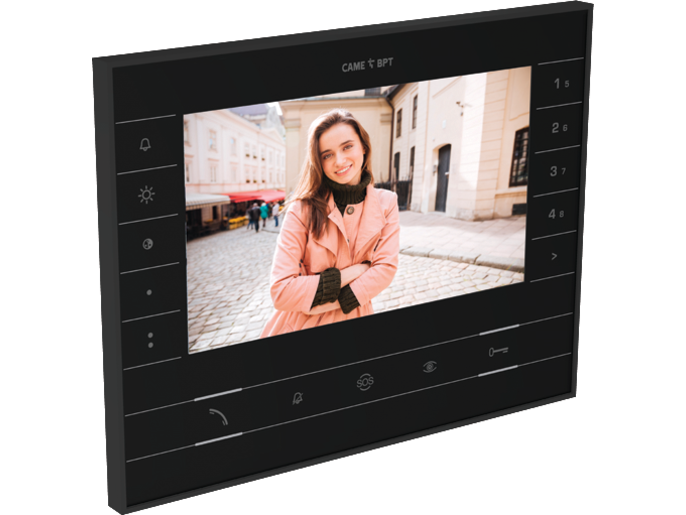 Настенный монитор с ЖК-дисплеем 7 дюймов. На левой стороне находятся кнопки активации экранного меню, включения автоответчика (фотофиксации посетителей), навигационная кнопка и две дополнительные кнопки, а на правой – кнопки, позволяющие совершать до 8 вызовов по интеркому.